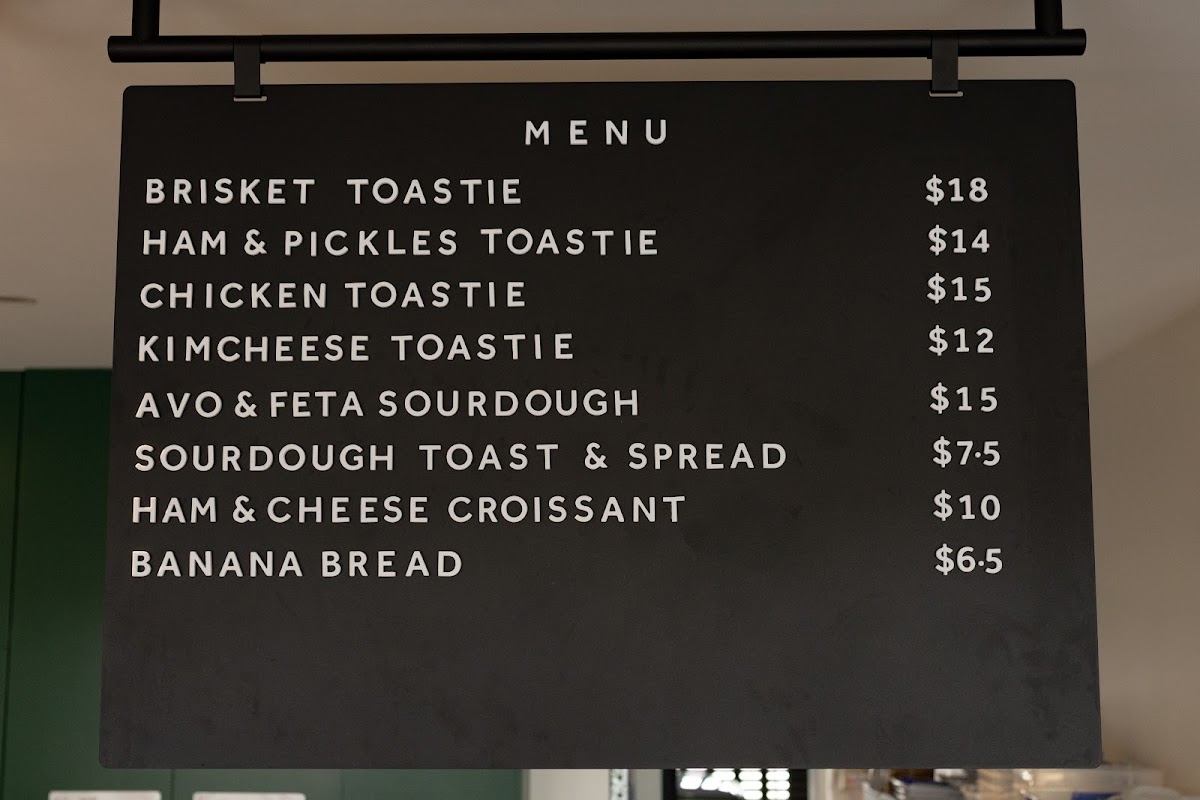 Toasties and Sandwiches: The menu features several hot toastie options including chicken, ham, brisket, kimcheese, and artichoke toasties. These are paired with quality bread selections like sourdough and croissants, with additional options such as ham & cheese croissant and avo & feta sourdough.